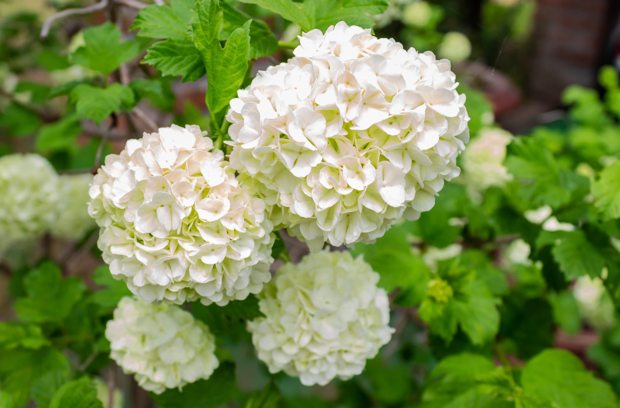 * Kwiaty: Ogromne, kuliste kwiatostany do 35cm średnicy złożone z setek drobnych, płonnych kwiatów. Kwiaty są czysto białe.