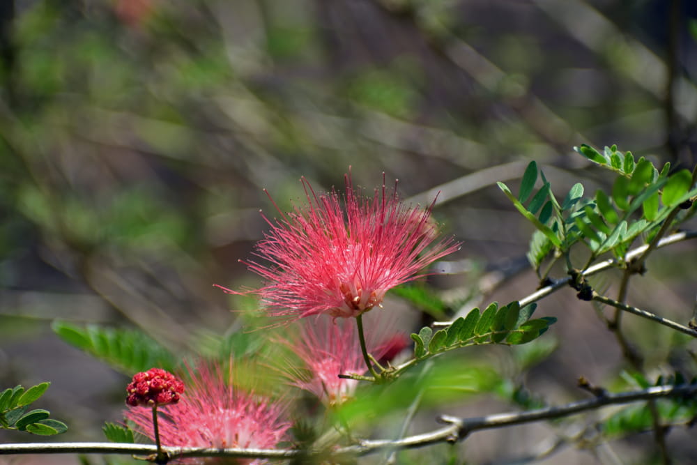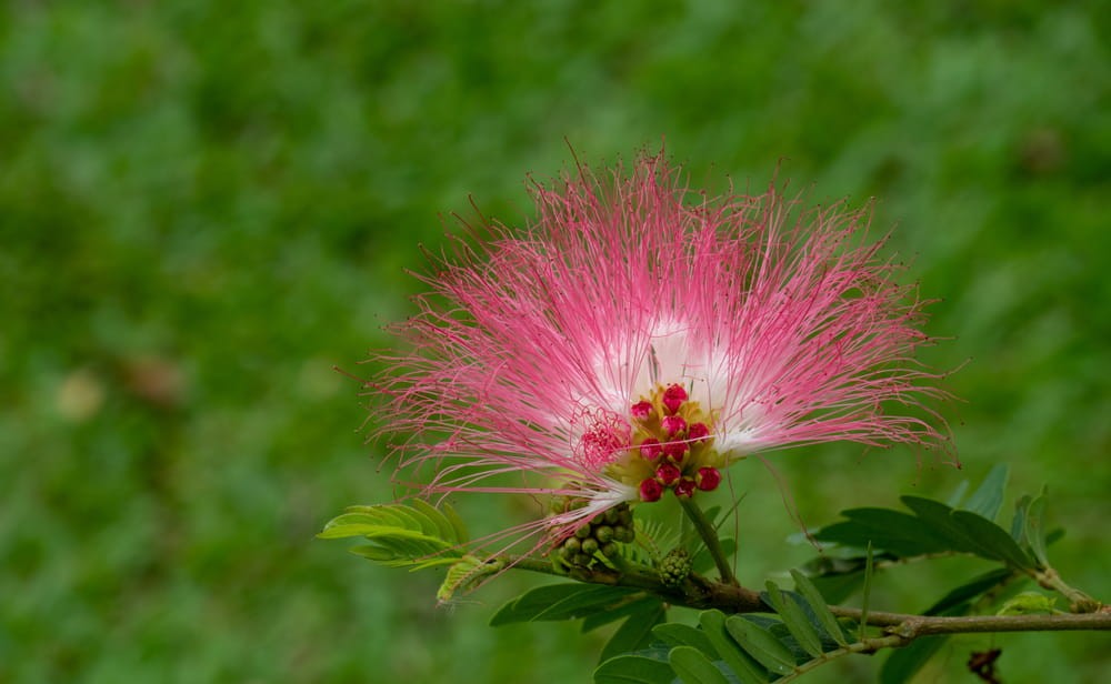 Kwiaty w formie „pudrowych pędzelków”: obfite, puszyste, różowe lub różowobiałe kwiaty z licznych długich pręcików, przypominające pompony.
